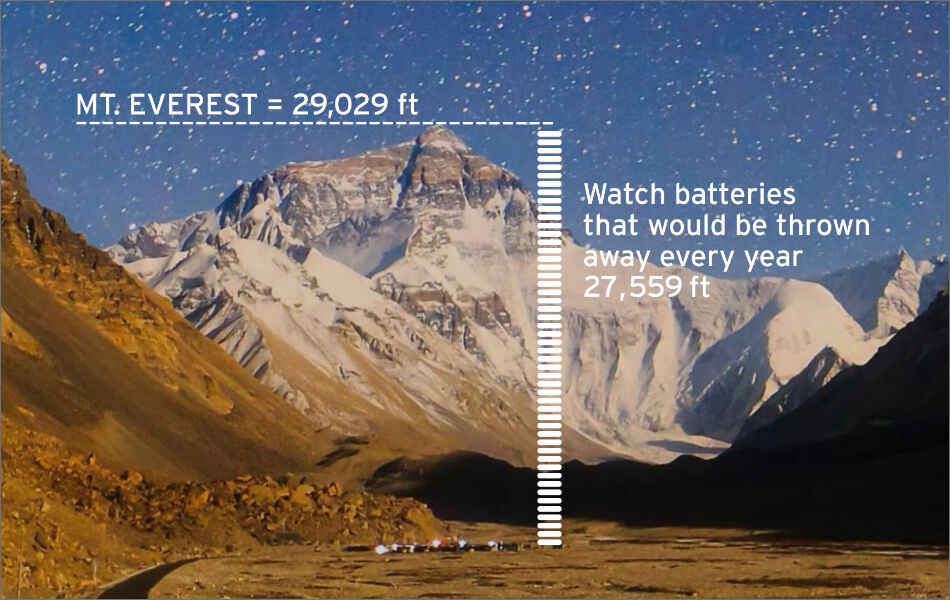 Each year, for the past 47 years, we keep enough batteries out of landfills to stack up to the height of Mount Everest. We’re taking the next step in raising awareness on the benefits of Eco-Drive technology and its ability to reduce battery waste in landfills by encouraging people to join us on our mission in creating a more sustainable planet.
